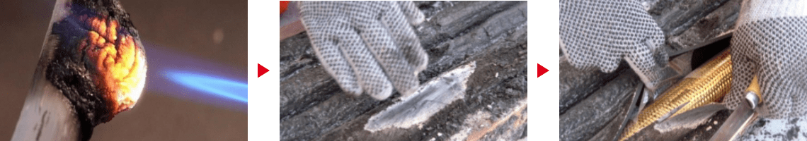 코팅되지 않은 케이블(왼쪽)은 2분 이내에 케이블 피복이 손상되어 단락 사고 발생
